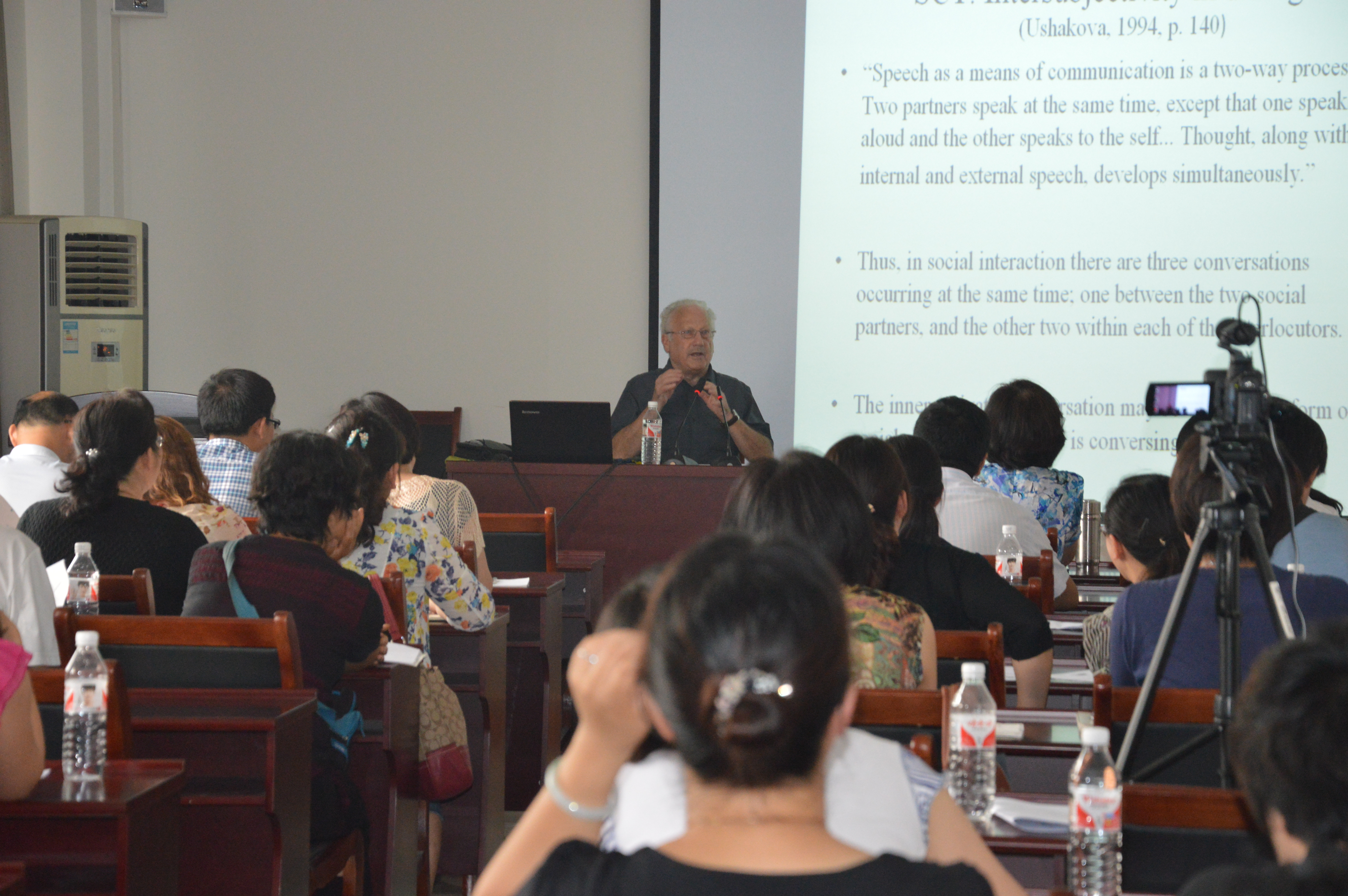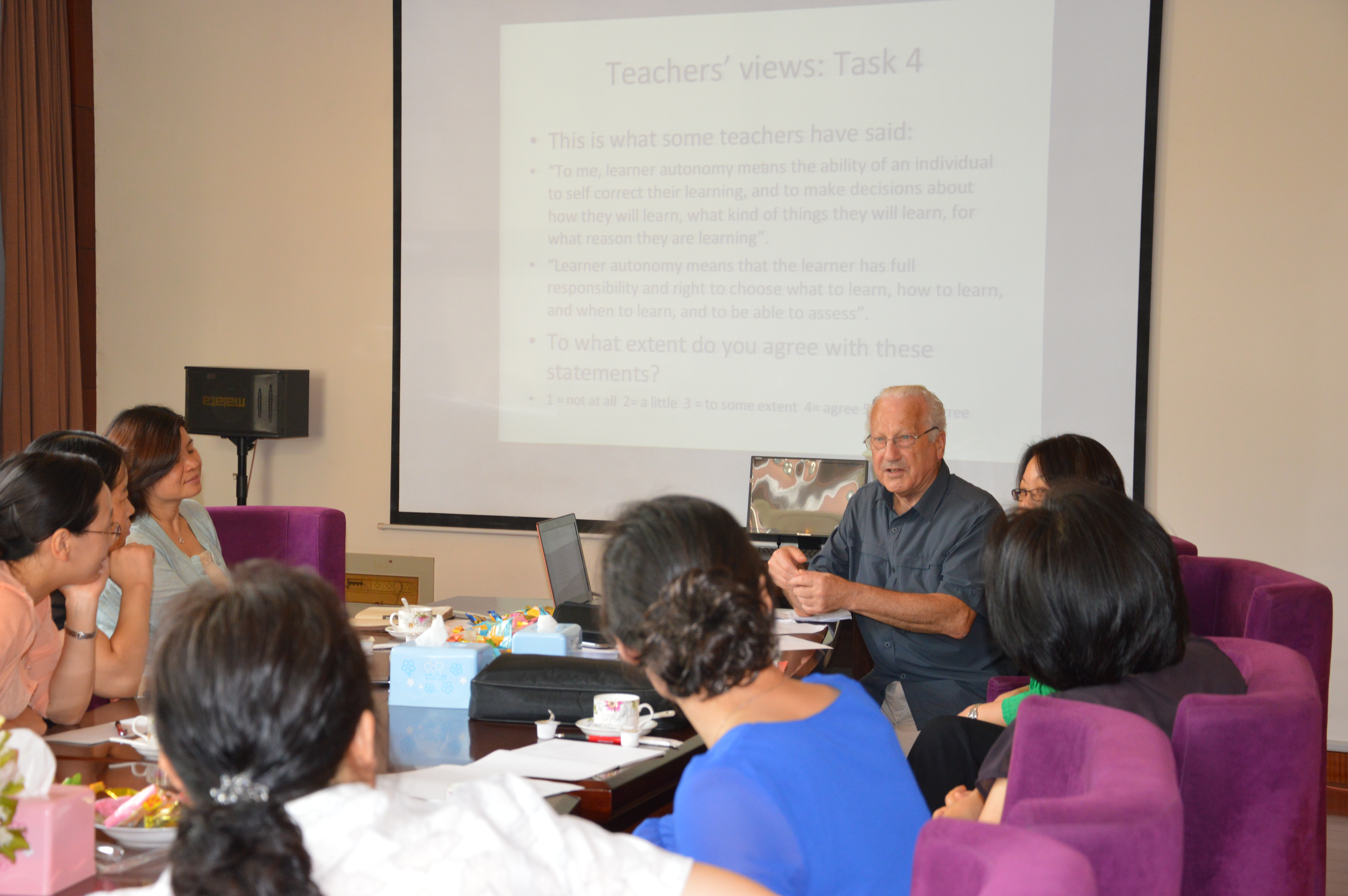 Roger Barnard就“社会文化理论与应用语言学”和“研究方法选择”进行了系列报告与研讨。他回顾第二语言习得主流研究常用的实证主义方法,指出了其局限性;阐释了社会文化理论,尤其是最近发展区理论与脚手架理论,应用于第二语言学习与教学中的核心原则;提出在行动与探索研究中,教师应被视为输出知识的应用语言学家。随后,以研讨会形式,探讨了教师在教学实践中开展案例研究,收集定性数据的相关程序及注意事项。23日,Roger Barnard主持工作坊,以“教师关于学习者自主性的认知与实践”为主题,进行了教学与研究示范。