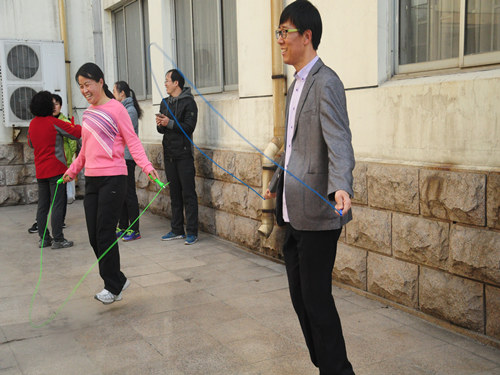 在比赛开始之前,教职员们在一旁有序地做着热身活动,为即将到来的比赛做准备。活动首先进行的是由6名女教职工2名男教职工组成的集体跳绳比赛。男职工负责摇绳,女职工负责跳绳,他们配合得非常默契,步伐一致。一旁的男教职工也不敢有丝毫松懈,两人用眼神交流着用力的大小。随即举行的是四人踢毽子比赛,教职员工们都精神抖擞,信心百倍。小小的键子在四人之间飞舞,他们抓住每一次机会将比赛愈演愈烈。两人跳绳比赛环节,计时一分钟,各组选手争分夺秒、互不相让。比赛过程中各位教职工秉承不放弃的精神,为公司学子树立正确的价值观。最后是个人跳绳和踢毽子比赛环节。各位教职工展现出昂样的斗志,只见他们气喘吁吁为超越自己而拼搏。活动结束后,公司为教职工们颁发纪念品。