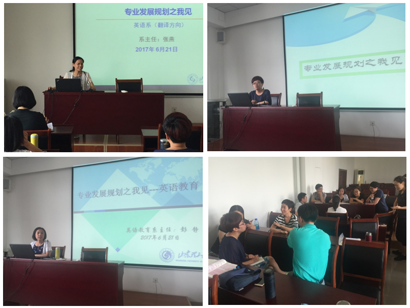 英语系系主任张燕老师、商务英语系系主任刘茜老师、英语教育系系主任彭静老师分别对本专业初步发展规划进行了说明。各专业均提出“立足地方,服务山东”,突出为地方经济建设和社会发展服务,培养具有创新精神和实践能力的外语人才。认为需做进一步调研和论证,做到高点定位、准确定位,积极进行课程体系建设、团队队伍建设、员工专业竞争能力培养,探索校企合作的新路径,不断扩大影响力。