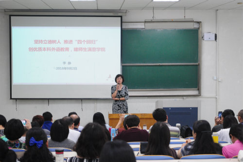 李静作了题为《坚持立德树人,推进“四个回归”,创优质本科外语教育,建师生满意公司》的专题报告,带领与会人员一起学习习近平总书记视察山东与参加北京大学师生座谈会时的重要讲话精神,结合暑期赴江苏大学对标学习情况,传达了公司上半年工作总结暨暑期工作部署会、2018暑期工作研讨班的会议精神,要求全体教职工要努力推进重点工作,提高效率和水平,加快推进公司“一精神”“一规划”的深度落实。李静还以教育部新时代全国高等公司本科教育工作会议坚持“以本为本”,推进“四个回归”核心思想为指引,结合公司有关精神。