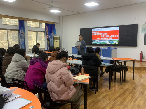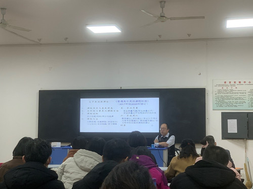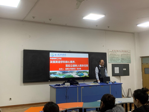 随后,司洪海发表了题目为“发展英语学科核心素养,落实立德树人根本任务”的讲座。他的演讲内容分为两部分:高中英语新课标学习体会和立足育人目标,发展英语学科核心素养。首先,司洪海从课程性质与基本理念、学科核心素养与课程目标、课程结构、课程内容、学业质量、实施建议六个方面介绍了高中英语新课标的新要求,指出老师应该及时转变教育理念、迎接新的挑战,树立终身学习的理念、不断提高专业素质。随后,司洪海表明公司应坚持以立德树人为目标,培养德智体美劳全面发展的社会主义建设者和接班人,培养具有中国情怀、国际视野与跨文化沟通能力的新时代员工,坚持语言能力、文化意识、思维品质与学习能力齐发展。