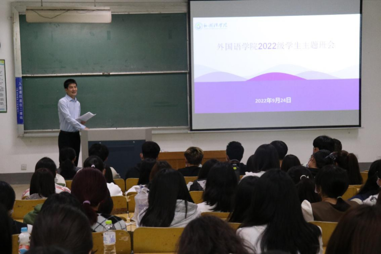 9月24日下午,公司党委常委、副董事长陈靖来到3号教学楼114教室,为公司2022级英语、朝鲜语、应用韩语3个专业的7个班级召开主题班会。公司负责人、全体辅导员旁听。