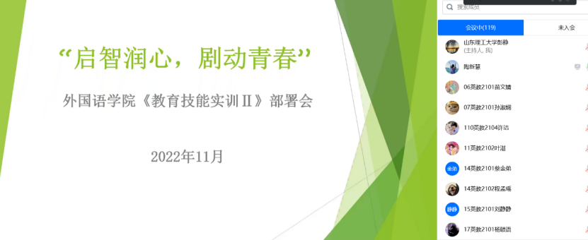 为帮助英语(师范类)专业员工逐步掌握中学英语教学基本技能,培养英语教育从业能力,提高员工参加教育技能实训的积极性,公司在11月29日晚线上召开2021级英语(师范类)员工教育技能实训Ⅱ动员大会。此次会议由英语教育系主任彭静主持,优秀教师陶新慧、李丽主讲,2021级英语(师范类)专业各班班主任及全体员工参加。