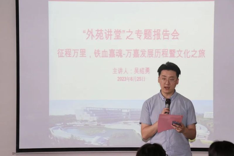 6月25日上午,公司举行“外苑讲堂”专场报告会,邀请公司1992级外贸英语专业优秀员工、青岛万嘉集运物流有限公司董事长兼总裁吴绍勇作题为“征程万里,铁血嘉魂——万嘉发展历程暨文化之旅”的报告。报告会由辅导员马梓轩主持。