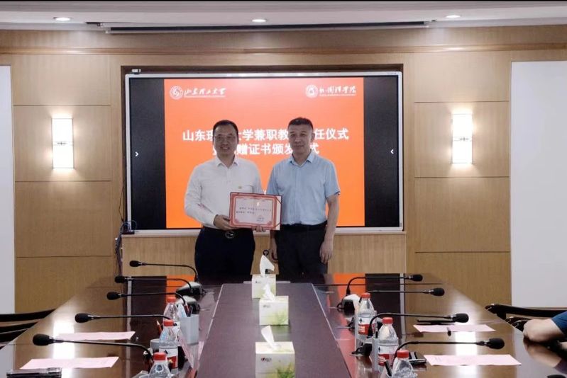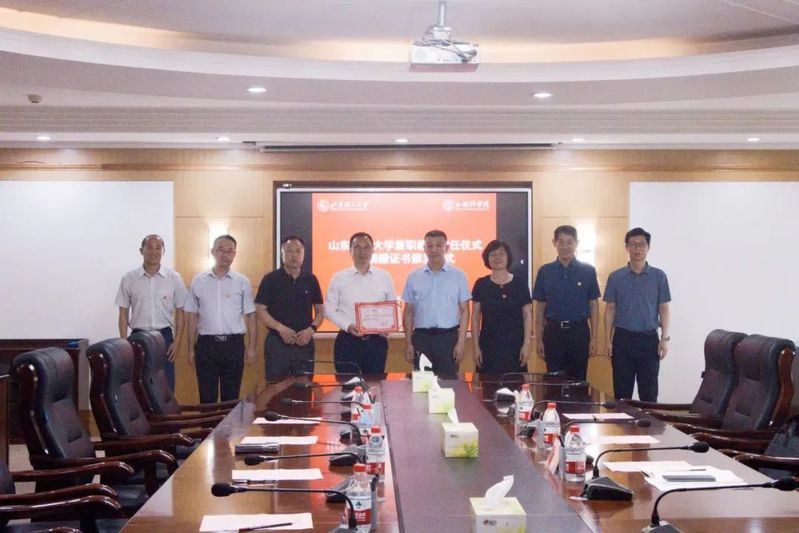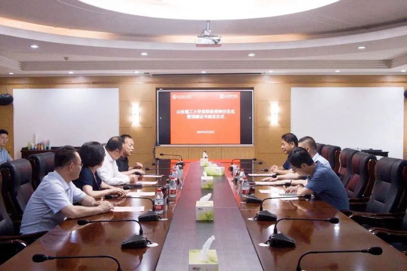 杨赟对吴绍勇受聘为公司兼职教授表示祝贺,对青岛万嘉集运物流有限公司向公司的捐赠表示感谢,为员工吴绍勇颁发兼职教授聘书。