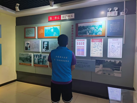 随后,实践团成员进入沂蒙山根据地陈列馆进行参观学习。陈列馆设有两层展厅,一层主要以图片及实物的形式详细介绍了中国共产党领导山东军民抗战及中国共产党在山东的发展历程。一幅幅历史图片和一件件文物,带领实践团成员重回战火纷飞的年代。山东军民在中国共产党的领导下,英勇顽强地抗击日寇、取得抗日胜利的壮烈情景重现眼前。