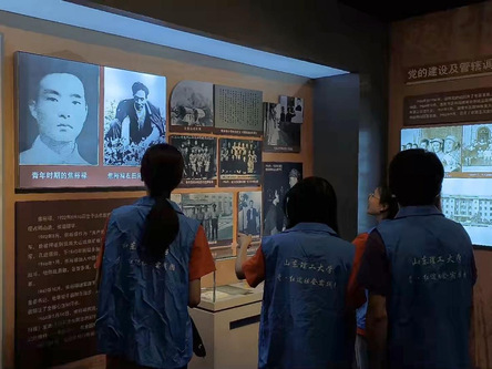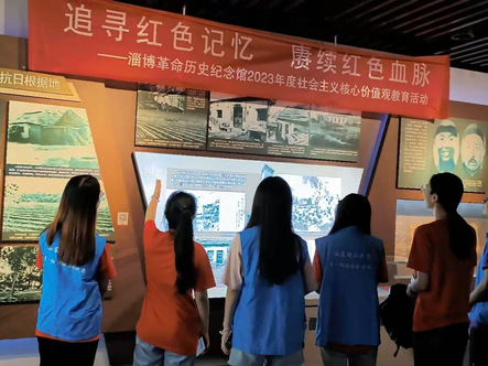 淄博历史展览馆前厅以大型浮雕的形式展现淄博悠久的历史,繁体“齐”字寓意淄博是齐文化的发祥地,古代战车象征淄博乘着历史的车轮滚滚向前。展览馆以党的领导为主脉络,以时间顺序为主线,以各个发展历史时期的重大事件为主要内容,通过多幅珍贵图片、多件珍藏品等展陈手段,全面展示淄博从古到今的历史变迁和建设发展成就,生动再现淄博人民不屈不挠、甘于奉献的伟大精神。为进一步弘扬爱国主义红色文化并使其于党的二十大精神有机结合,实践队成员重点学习抗日战争、解放战争、改革开放和现代发展中的淄博。