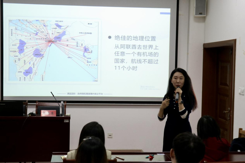 颜晓惠指出,海外就业实习可以丰富个人履历、增加国际化经验、快速提升实用型英语水平且有更多的就业选择机会,同时可以为回国发展奠定良好基础。她以“迪拜机场免税店”“卡塔尔航空”“海外中资企业阿曼金龙集团管培生招聘”等为例为毕业生提供了海外就业的选择,并详细讲解了同学们关心的海外实习就业生活、安全、职业发展等方面信息。