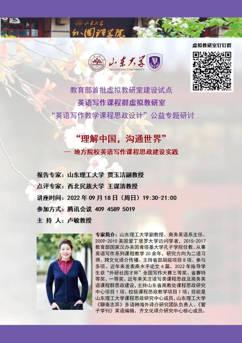 “问渠哪得清如许,为有源头活水来。”为使自己成为一位合格的教师,贾玉洁在巨大的工作压力下,积极参加教研教改。近年来,她先后主持了校级教研课题6项,山东省十三五规划教育课题1项、省教育厅课程思政项目1项;2013年《经典阅读与写作》课程获批校一流本科课程;作为核心成员参与省级教改项目、省一流课程、省一流本科专业建设项目、校级教研项目10余项。2023年获教学创新大赛三等奖、校级教学成果二等奖;2022年9月受邀在教育部英语写作课程虚拟教研室作“课程思政建设实践”专题发言。贾玉洁秉持着勤学笃行、求是创新的躬耕态度,践行追求卓越的教育家精神,坚持将自己的科研成绩反哺到教书育人中。她围绕自己的研究方向,指导本科生在毕业论文阶段开启学术探索之路,激发员工的科研兴趣。5年来她所指导的本科生有3位获得校级优秀本科毕业论文。