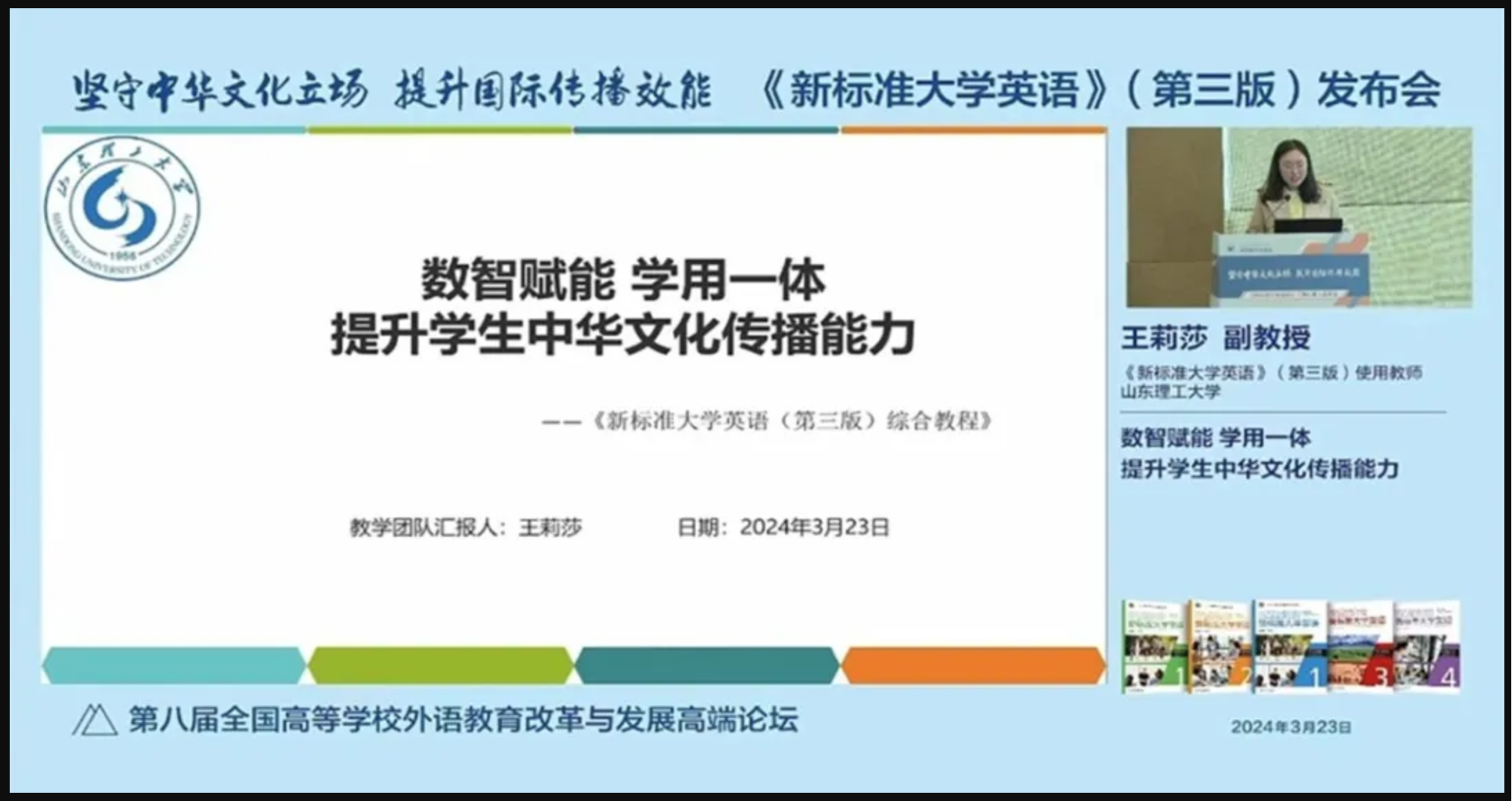 近日,公司大学英语教学团队在第八届全国高等公司外语教育改革与发展高端论坛专题活动中做分享发言,王莉莎副教授以“数智赋能,学用一体,提升员工中华文化传播能力”为题分享了公司大学英语教学借助《新标准大学英语》(第三版)教材使用开展教学改革的实践经验。