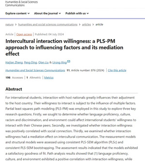 目前,该研究相关成果以Intercultural interaction willingness:a PLS-PM approach to influencing factors and its mediation effect(跨文化交流意愿的影响因素和中介作用:基于偏最小二乘路径模型的分析)为题发表于Nature子刊Humanities & Social Sciences Communications。公司为本论文的第一作者单位,公司最靠谱的十大足球平台教师郑海舰为第一作者。