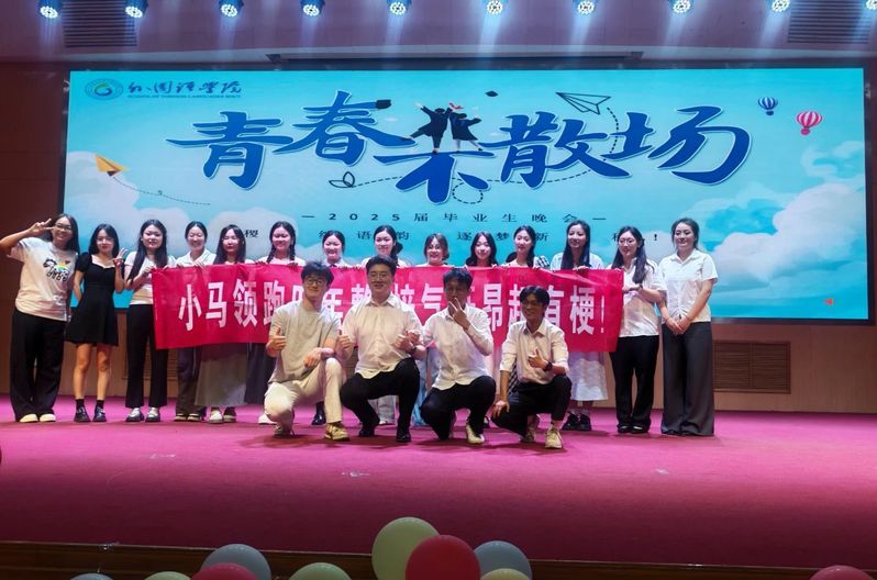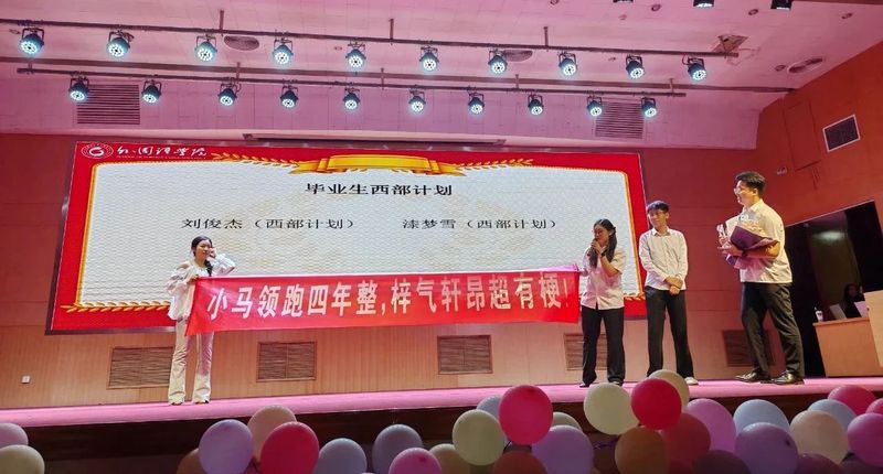 颁奖结束后,毕业生辅导员马梓轩向全体员工送上祝福,他感谢了四年以来与同学们的风雨同舟、支持信任、相互成长,他深情的祝愿全体毕业生前程似锦、鹏程万里。随后,一条真挚的横幅更印证了师生的情谊,“小马领跑四年整,梓气轩昂超有梗”是全体毕业生对辅导员的深情“告白”,当毕业的旋律轻轻流淌,这条横幅成为了感恩的信笺、祝福的翅膀,让师生间的牵挂与期许,照亮了每一段即将启程的远方。