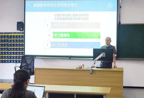 随后,谭洪进以《人工智能赋能大学英语教学的创新与实践》为题,从智慧教学手段及资源建设情况,以及智慧教学赋能教学全过程的实践及效果等方面进行了详细汇报。他结合实际教学经验,生动地阐述了如何巧妙运用智慧教学平台优化大学英语教学,激发员工学习兴趣,提升教学质量,为在场教师提供了宝贵的教学借鉴。