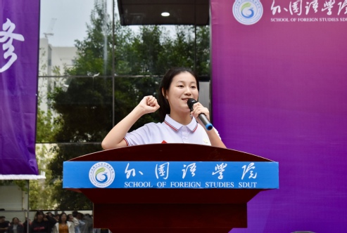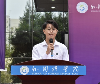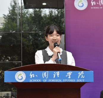 仪式第三项,2025级新生代表朱亿卿发言。她表达了对老员工活的憧憬与决心,并结合“内外兼修,中西贯通”的院训,阐述了成长为复合型外语人才的自我路径,并代表全体25级新生表示:将以勤学为本,固基强能;实践为要,知行合一;情怀为魂,贯通中外,不负时代、不负韶华,共同书写绚丽的青春篇章。