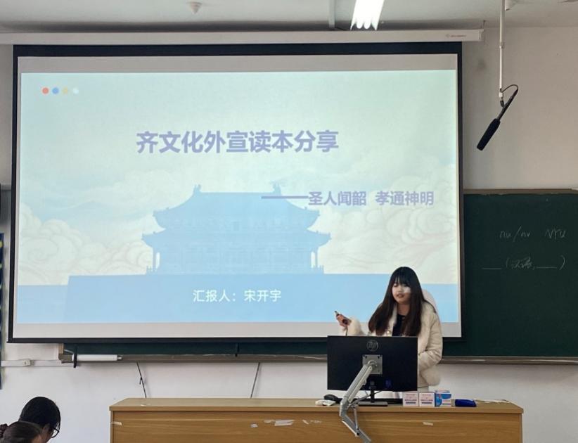 本次读书会设置了嘉宾谈荐书、研究生品评荐书、交流互动和嘉宾点评等四个模块。第一个模块由张燕副经理谈荐书,她在肯定往期读书会丰硕成果的基础上,指出读书会既要侧重分享更需侧重产出。这次推荐阅读汉英对照读本的目的一是强化同学们对齐文化英译及传播效果的思考,二是通过对所荐译本进行翻译批评从而提升同学们的产出能力。她还鼓励大家交流译介心得、碰撞外宣思路,用专业的翻译能力让齐文化以更鲜活、更立体的姿态走向世界,让世界更好地读懂齐文化、读懂中华文化。
